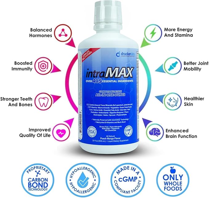 • ENHANCED ABSORPTION RATE & INTRACELL TECHNOLOGY: Drucker Labs IntraMAX 2.0 and IntraMIN products are created using a proprietary carbon-bonding process called intraCELL technology. This technology allows living carbon to bind to nutrients within each product to provide a faster, more efficient absorption rate. The result is complete liquid nutrition in just one ounce a day!