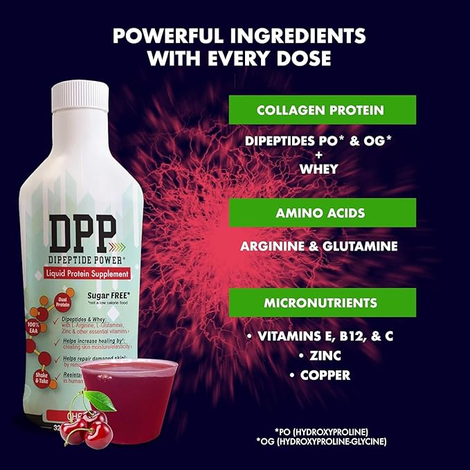 Nutritional Designs DPP Dipeptide, Wound-Healing Liquid Collagen & Whey Protein Supplement, Sugar-Free, Promotes Healthy Skin & Hair for Men & Women (Cherry, Bottle, 32 Fl Oz)