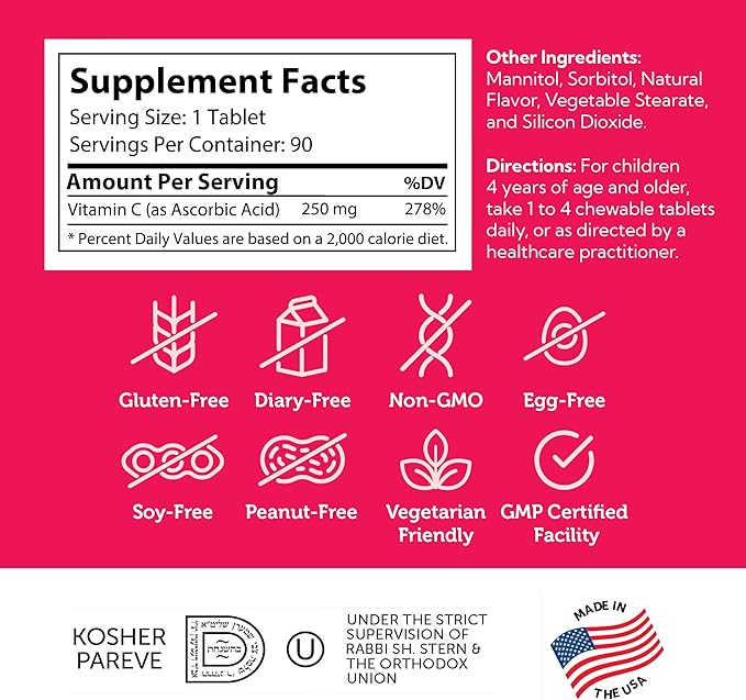 • VITAMIN C BOOSTER - Each delicious Vitamin C chewable tablet contains 250mg of Vitamin C. This essential vitamin helps support the immune system. It also supports collagen production, collagen is essential to the muscles, joints and blood vessels of growing kids.
