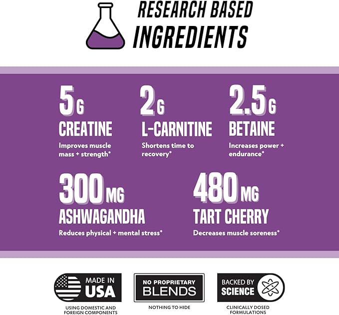 • Backed By Science: Our deliciously flavored post-workout powder for men and women contains ingredients backed by peer-reviewed scientific research at the proper dose to maximize your muscle recovery, including Creatine Monohydrate, Betaine, Tart Cherry Powder, and L-Carnitine