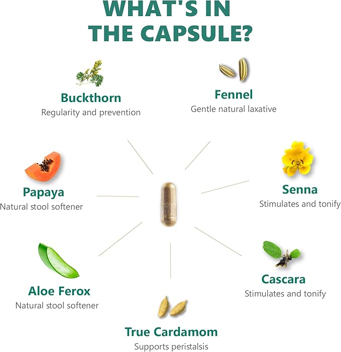 • 100% NATURAL INGREDIENTS : Carica Papaya, Aloe Ferox, Cassia Angustifolia, Rhamnus Frangula, Rhamnus Purshiana (Cascara sagrada), Elettaria Cardamome, Foeniculum Vulgare. All-natural herbal formula to ease digestion, regulate metabolism, relieve the symptoms of constipation, and most importantly help strengthen and support the digestive system.