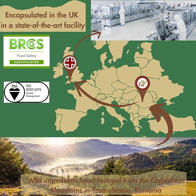 • Ethical, sustainable, healthy: Our mission is to bring you natural food supplements that are good for you as well as good for the planet. Chemical-free, cruelty-free and non-GMO, our Made of Wild Immune Support capsules are hand-crafted to high ethical and green standards, and suitable for vegetarians and vegans. Our packaging is fully recyclable. We’re continually working to reduce our environmental footprint, and our foraging methods support the health of our beautiful Transylvanian forests.