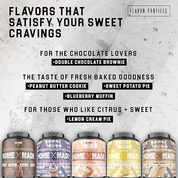 • Home Made uses the highest quality ingredients, such as whole-grain oat flour, sweet potato flour, whey protein, egg protein, brown rice protein, and medium chain triglycerides, to provide you with an adequate amount of macronutrients and micronutrients