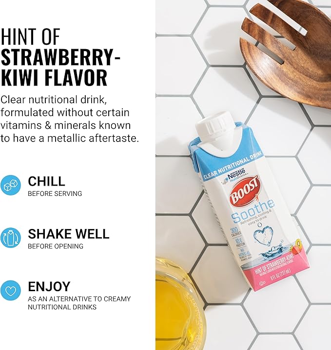 • Cooling Effect: BOOST is a great-tasting clear nutritional drink providing 300 calories, 10 g of protein along with a soothing, cooling effect in the mouth to help patients get nutrition they need.