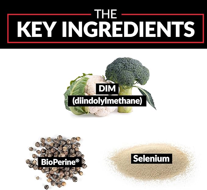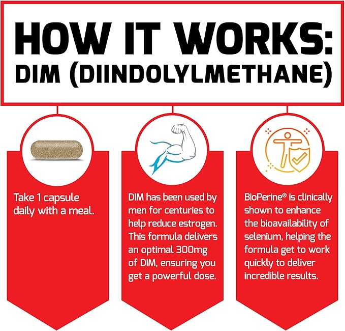 • DECREASE ESTROGEN: DIM, short for dinndolymethane, is a unique compound believed to help decrease estrogen levels in men. At concentrated amounts, DIM is thought to work by inhibiting the enzyme responsible for converting testosterone into estrogen.