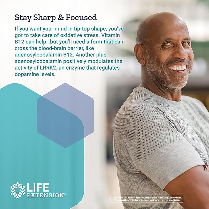 • STAY SHARP & FOCUSED – If you want your mind in tip-top shape, you’ve got to take care of oxidative stress. Vitamin B12 can help...but you’ll need a form that can cross the blood-brain barrier, like adenosylcobalamin B12. Another plus: adenosylcobalaminpositively modulates the activity of LRRK2, an enzyme that regulates dopamine levels.