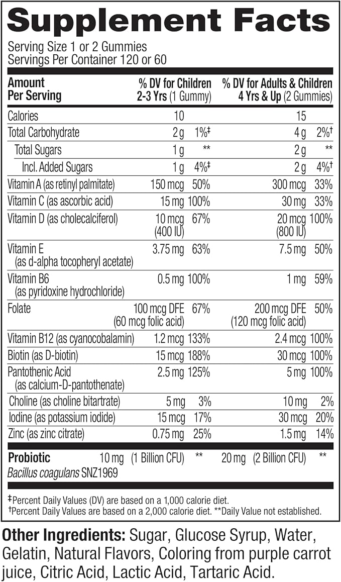 • HOW TO TAKE: Kiddos 2-3 years, chew one kids multivitamin gummy with probiotics daily. 4 years and up, chew two gummies daily.