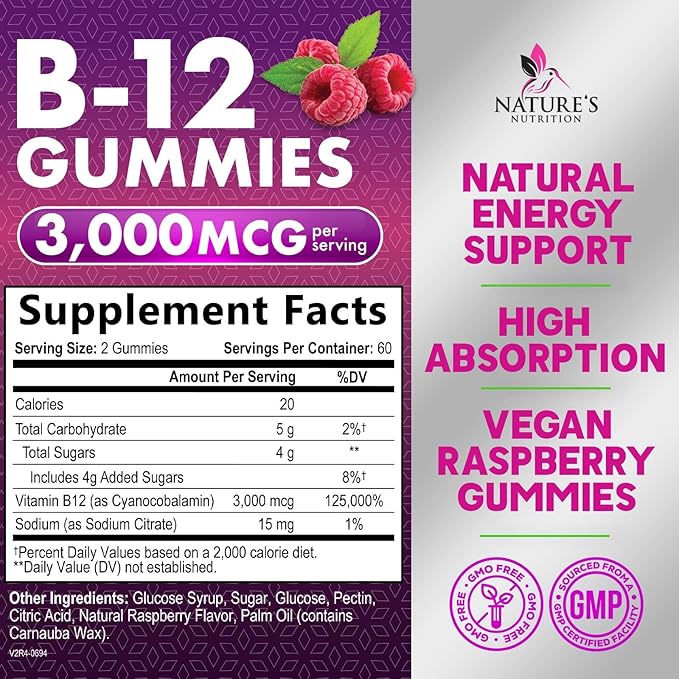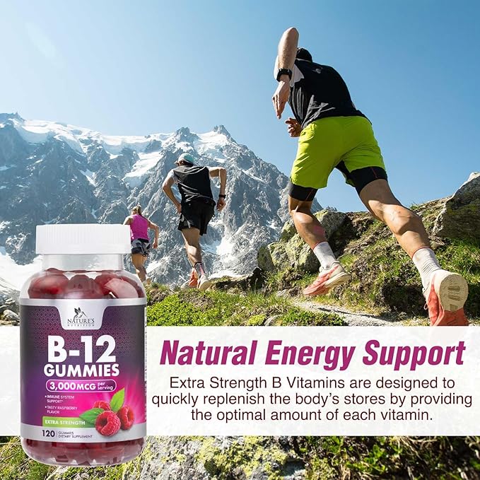 • B12 Energy Gummies by Nature's Nutrition: b12 energy over 1000 12 3000 5000 5000mcg for adults b b13 bitamin chewable gummies gummy mcg pills supplement supplements vitamin vitaminas vitamins women and 30 45 90 day supply complex extra system 100 count strength per s serving tablets 2 2500 flavored 1 500 servings cherry dietary health high with immune support raspberry
