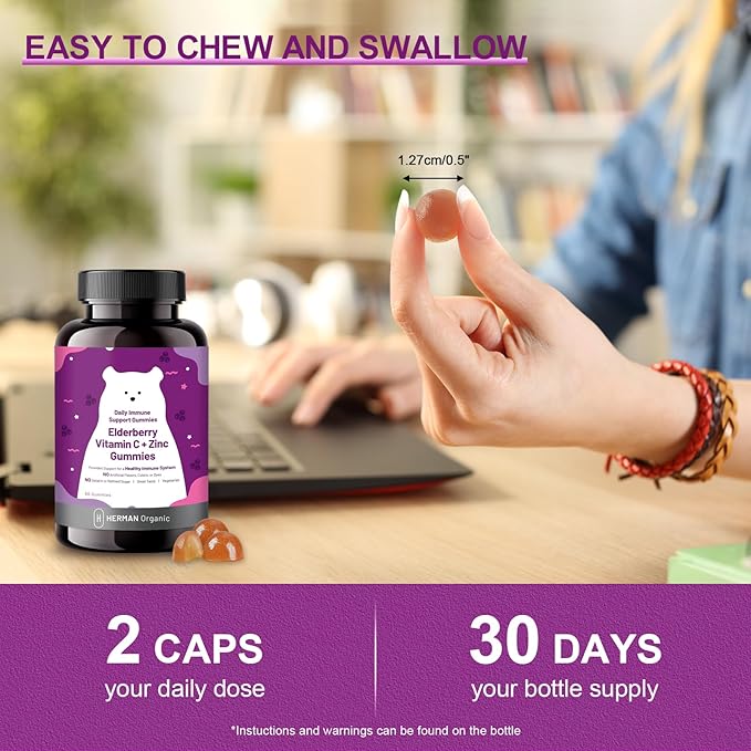Herman Organic Elderberry Gummies for Kids and Adults,with Vitamin C, Zinc and Sodium, 3-in-1 Daily Immune Support Supplement,Gluten Free, Vegetarian(60 Gummies)