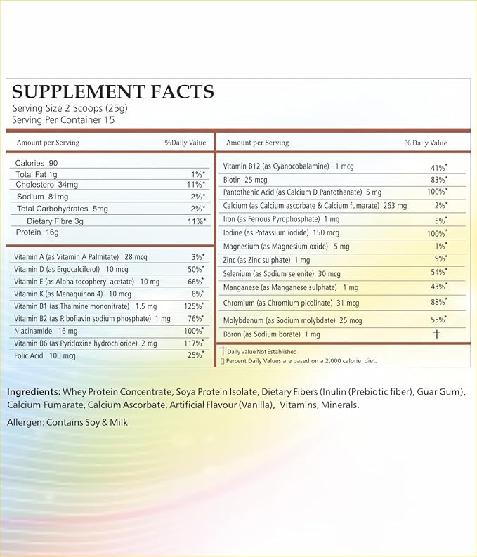 • TASTE BEST PROTEIN POWDER: Makes a Delicious Vanilla Protein Shake with HIGH QUALITY SUSTAINED RELEASE PROTEINS (63g/100g), from plant & dairy source with PDCAAS score of 1, offering complete amino acid profile exerting less load on the gut. This Comprehensive blend with 24 Crucial Vitamins Minerals, Antioxidants & Dietary Fiber (11g/100g) including Prebiotic FOS can support various physiological processes, overall health & help promote good gut flora & satiety without bloating. Added NO Sugar, NO Artificial Sweetener, NO Maltodextrin.