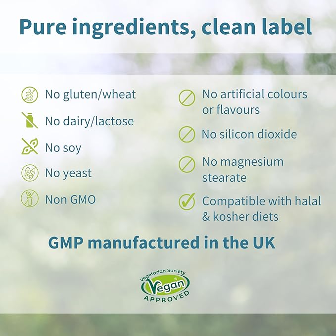 • PURE & CLEAN vegan, non-GMO, hypoallergenic & lab-verified ingredients with no unpleasant fillers (silicon dioxide, magnesium stearate or titanium dioxide). GMP manufactured in the UK