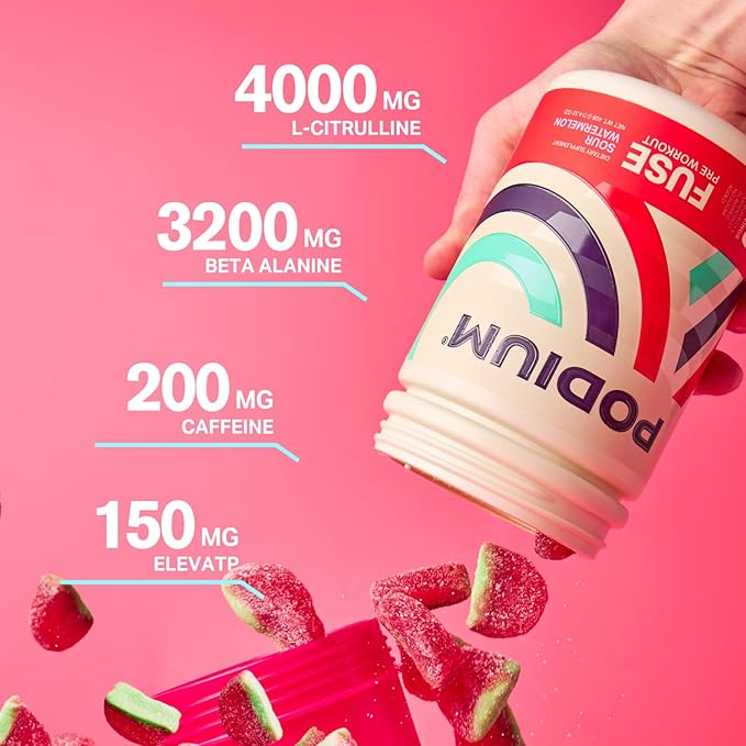 Podium Nutrition, Fuse Pre Workout Powder, Sour Watermelon, 30 Servings, Beta Alanine and Caffeine for Energy, Gluten Free, Soy Free, Dairy Free