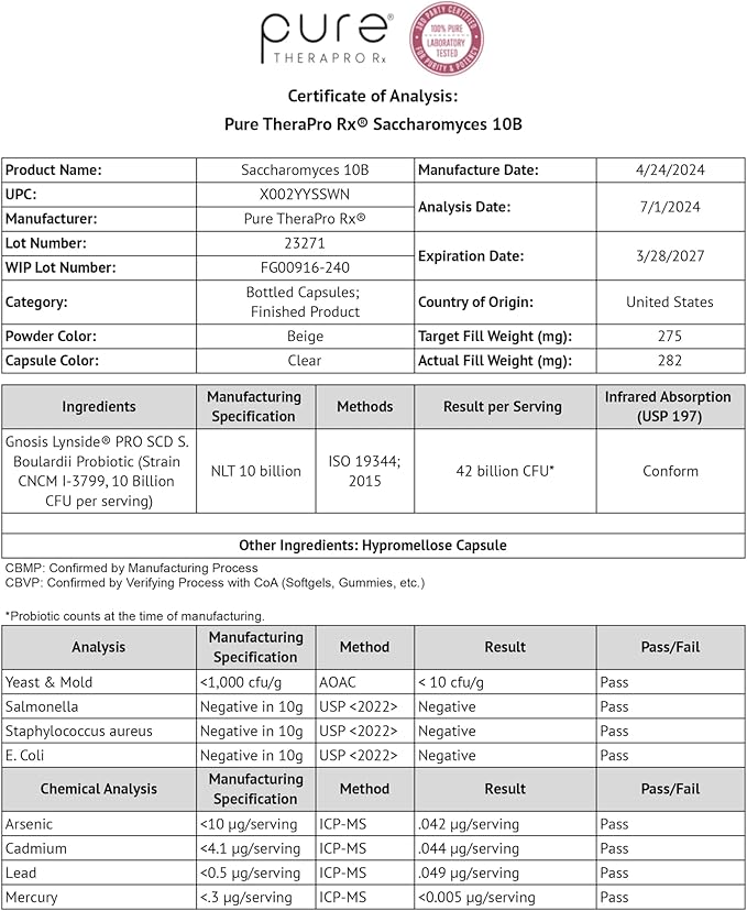 • 𝐂𝐀𝐍 𝐁𝐄 𝐔𝐒𝐄𝐃 πƒπ€πˆπ‹π˜: Pure TheraPro Rx Saccharomyces probiotic capsules deliver a minimum of 10 billion colony-forming units per daily serving (250mg per capsule). These probiotics supplement capsules quickly achieve high concentrations in the GI tract, then clear within 3-5 days after discontinuing use. Take 1 to 2 capsules daily in the morning or as directed by a healthcare provider.