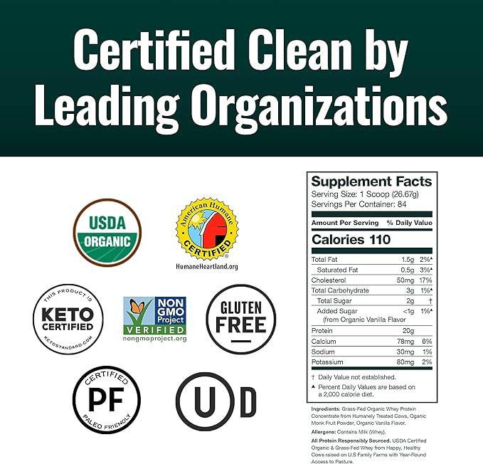 • Grass Fed Organic Whey Protein Powder – The original Organic Grass Fed Whey is now stevia-free and sweetened only with organic Monk fruit! Impeccable quality, delicious taste, and USDA organic, grass-fed whey protein. No additives, sugar, fillers, or lecithin. It is a “farm to shake” experience that can’t be beat!