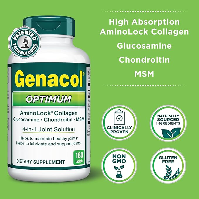 Genacol Glucosamine, Chondroitin, MSM and Collagen Joint Support Supplement for Men & Women Joint Health Patented Formula | Glucosamina Condroitina y Colageno Optimum 180 Tablets