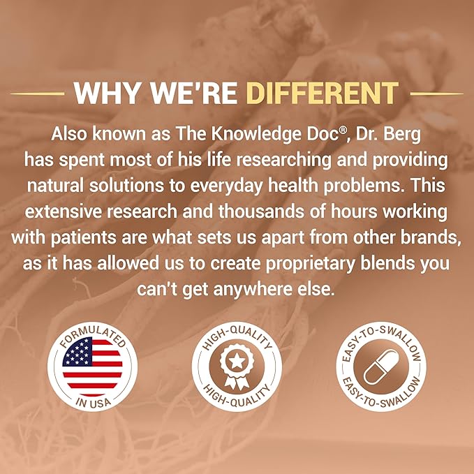 • 𝗪𝗛𝗬 𝗪𝗘’𝗥𝗘 𝗗𝗜𝗙𝗙𝗘𝗥𝗘𝗡𝗧 - Also known as The Knowledge Doc, Dr. Berg has spent most of his life researching and providing natural solutions to everyday health problems. This extensive research and thousands of hours working with patients are what sets us apart from other brands, as it has allowed us to create proprietary blends you can’t get anywhere else.