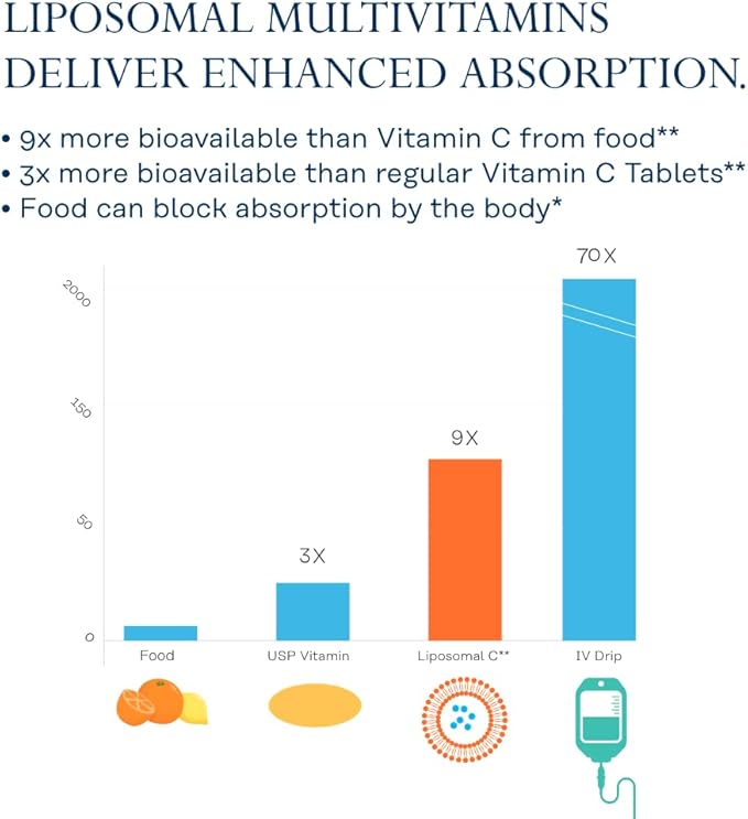 • Enhanced Absorption: Because most supplemental vitamins don’t survive stomach acid, our Liposomal Multivitamin uses advanced technology to form a protective vehicle around each nutrient that may help deliver it directly to cells for greater absorption and gentler digestion.*