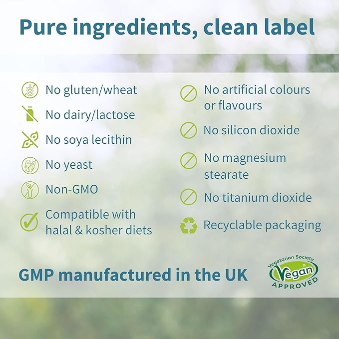 • PURE & CLEAN: vegan; non-GMO; hypoallergenic ingredients with no unpleasant fillers (silicon dioxide, magnesium stearate or titanium dioxide); natural taste with no added flavors. Lab verified, GMP manufactured in the UK