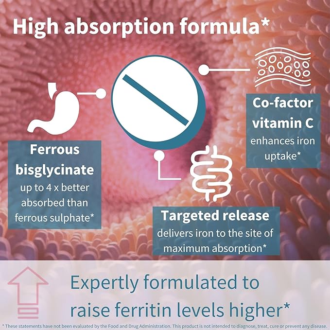 • IRON COMPLEX WITH VITAMIN C – expertly formulated to raise ferritin levels higher, with an effective daily dose of 20mg of bioavailable iron bisglycinate, combined with vitamin C to support the transport of iron, enhancing uptake in the body