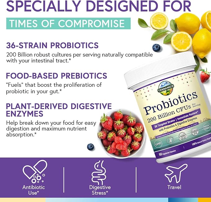 Terranics Daily Probiotics for Men & Women, 200 Billion 36 Strains Immediate Restore Probiotics, with Prebiotics & Enzymes, Healthy Regularity, Delayed Release, Shelf Stable, 60 Veggie Caps