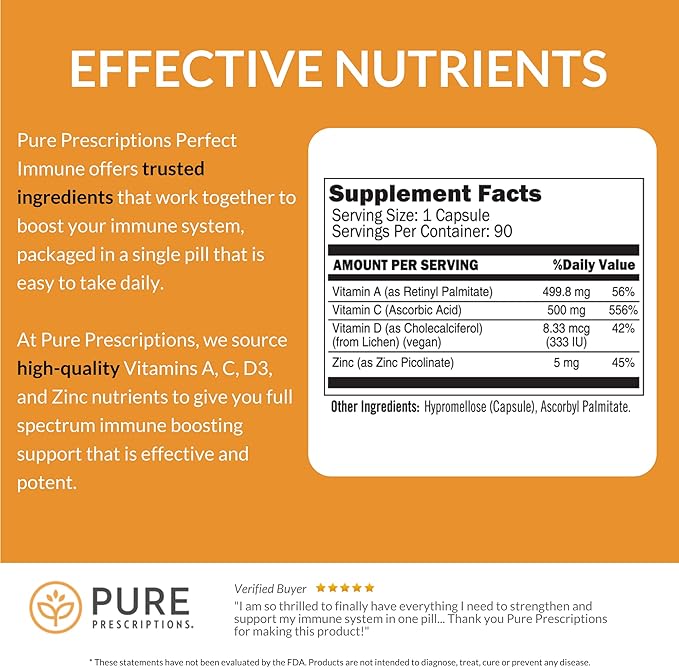 Perfect Immune Support Supplement with Vitamin C and D Plus Zinc and Vitamin A, 4 in 1 Immune Booster Vitamin Supplement, USA Made, GMO Free, Gluten Free, Veg Capsules - 60 Count