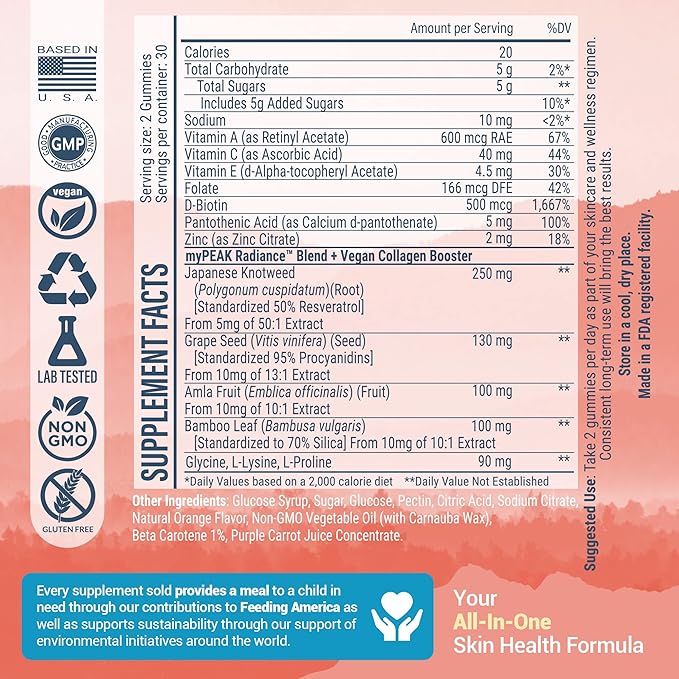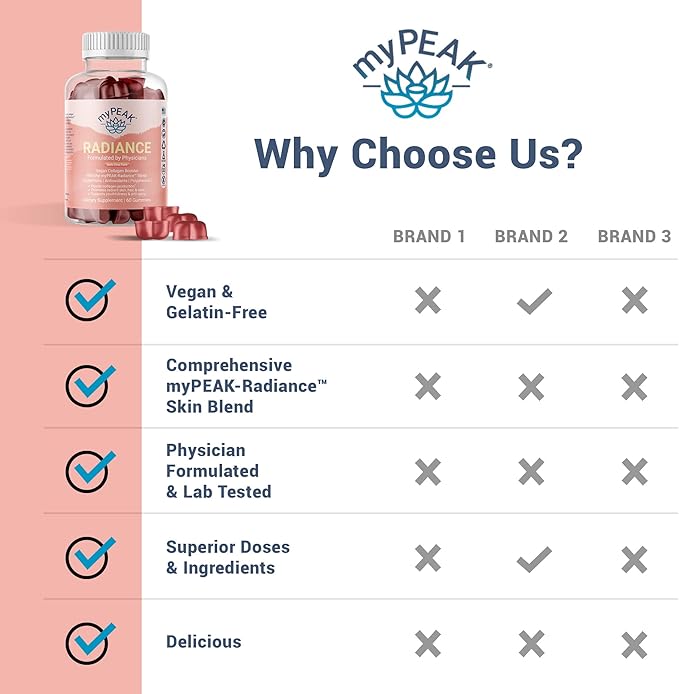 • Unleash Your Natural Radiance from Within - Radiance was made for you by physicians with your glowing skin, hair, and nail health in mind. Radiance combines comprehensive science-based, skin-health nourishing supplements and skin supporting vitamins into two delicious exotic citrus gummies a day. myPEAK Radiance vegan collagen supplement and collagen booster spotlights: Resveratrol, Grape Seed, Amla Fruit, Bamboo Leaf, Collagen Amino Acids, Biotin and Vitamins A-C-E + Zinc