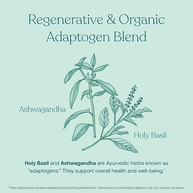 • MIND & BODY - Healthy soil produces high-quality, nutrient-dense ingredients. With an organic and regenerative adaptogenic Auryvedic herbal blend of holy basil and ashwagandha to help the body adapt to stress and support overall health and well-being. As we age our bones need a little extra love. Together, vitamins D3 and K2 support healthy bone density, help you absorb calcium effectively and retain the calcium that’s already in your bones.