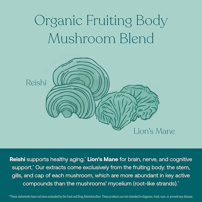 • ORGANIC MUSHROOM BLEND - We use certified organic fruiting body mushroom extracts that are grown naturally on substrate materials native to each mushroom. Extracted to improve bioavailability, no grain fillers, and provides beta glucans and other compounds that support your health. Reishi supports healthy aging, Maitake and Turkey Tail support immunity, and Cordyceps support endurance which support an active lifestyle.