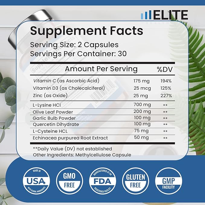 • Packed with over 9 essential vitamins designed to increase your immunity such as Vitamin C, Vitamin D3, Zinc 25mg, Echinacea, Garlic Bulb and L-Lysine HCL, Olive Leaf powder, Quercetin and L-Cysteine