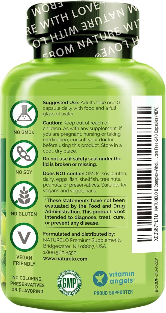 NATURELO B Complex - Whole Food Complex with Vitamin B6, Folate, B12, Biotin - Supplement for Energy and Stress - High Potency - Vegan - Vegetarian - Non GMO - Gluten Free - 240 Capsules