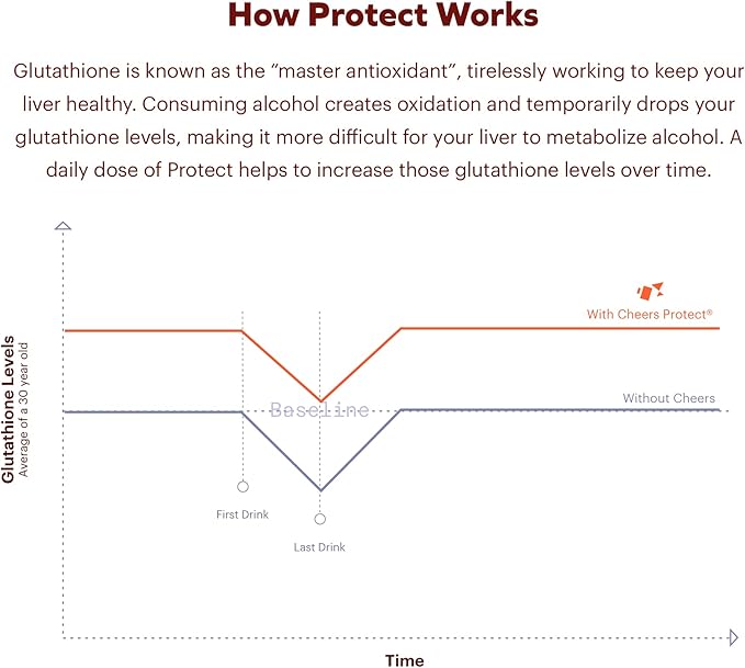 • Cheers Protect: a daily liver supplement designed to significantly increase glutathione levels, support overall liver health, and boost immunity. Each bottle contains 30 doses.