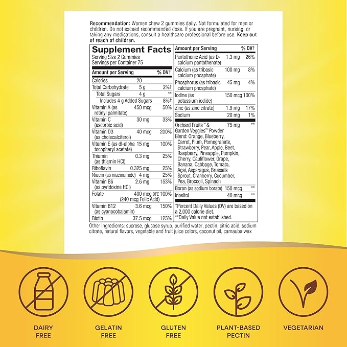 • Formulated with 16 vitamins and minerals for women’s wellness, including B-vitamins, vitamin A, vitamin C, vitamin D3, vitamin E, zinc and biotin, alongside food-based Orchard Fruits & Garden Veggies powder blend (75 mg per 2-gummy serving).*