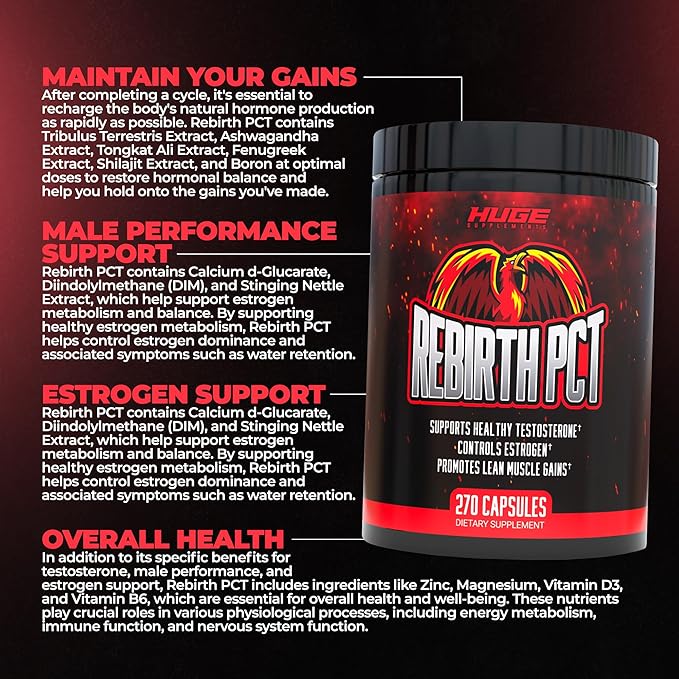 • Most Stacked Post Cycle Therapy: Rebirth PCT is renowned as the most comprehensive post cycle therapy supplement available. It features a potent combination of 19 scientifically backed ingredients designed to support hormonal balance and overall recovery after a cycle of performance-enhancing substances. This advanced formula addresses multiple aspects of post-cycle needs, estrogen regulation, male performance, and the maintenance of muscle gains.