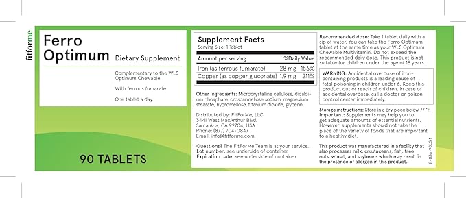 • Ferro Optimum is an iron tablet specially produced for bariatric patients after a Gastric Sleeve surgery. It is advisable to take Ferro Optimum as an additional iron booster besides the WLS Optimum Chewable. Expiration date: June/1/2025