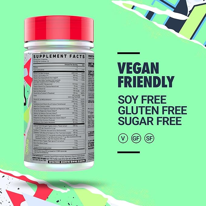 • Fully Loaded Multivitamin: GHOST Multi comes loaded with highly bioavailable forms of 21 Vitamins & Minerals, plus Lutemax 2020 for blue light support…AND it’s vegan-friendly.* Get ready to add this to your daily routine. Serving size 3 capsules, 30 servings per container.