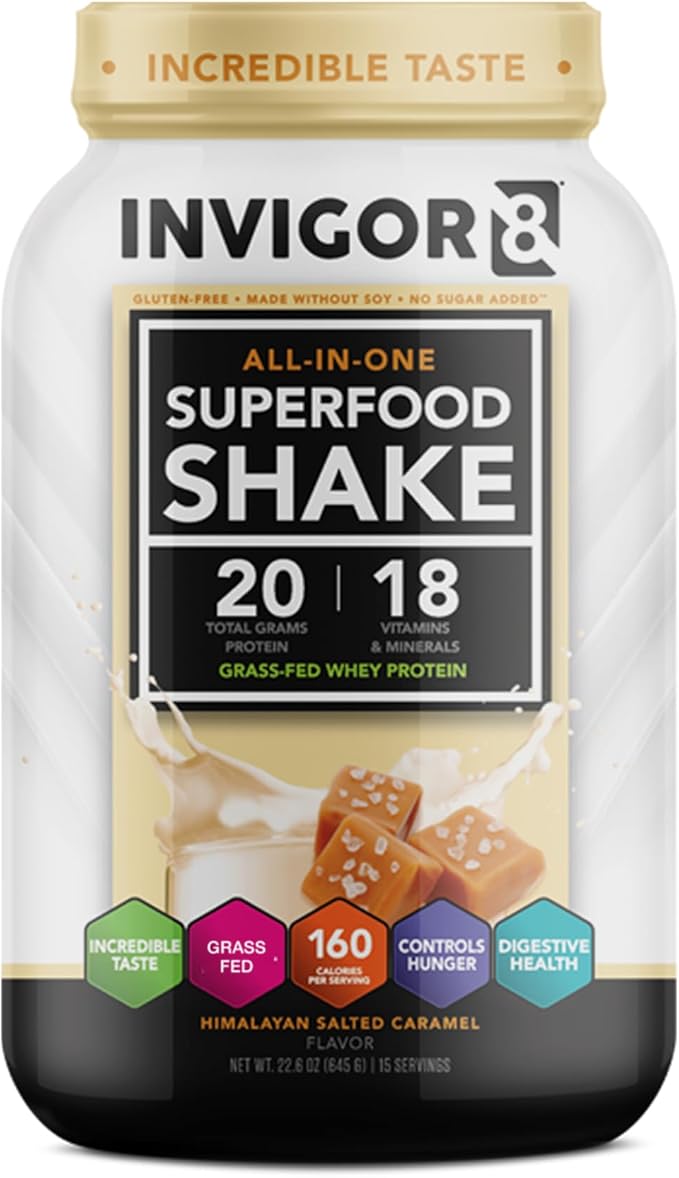 INVIGOR8 Superfood Grass Fed Whey Protein Isolate Shake Himalayan Salted Caramel Gluten-Free and Non GMO Meal Replacement with Probiotics and Omega 3 (645g)