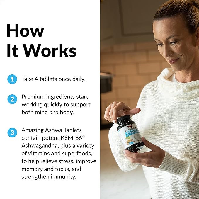 • CLINICAL STRENGTH FORMULA: Don’t settle for weak, underdosed ashwagandha capsules. Amazing Ashwa Tablets contain a clinical-strength dose of KSM-66 ashwagandha to help you relieve stress, think more clearly, and live life with more energy.