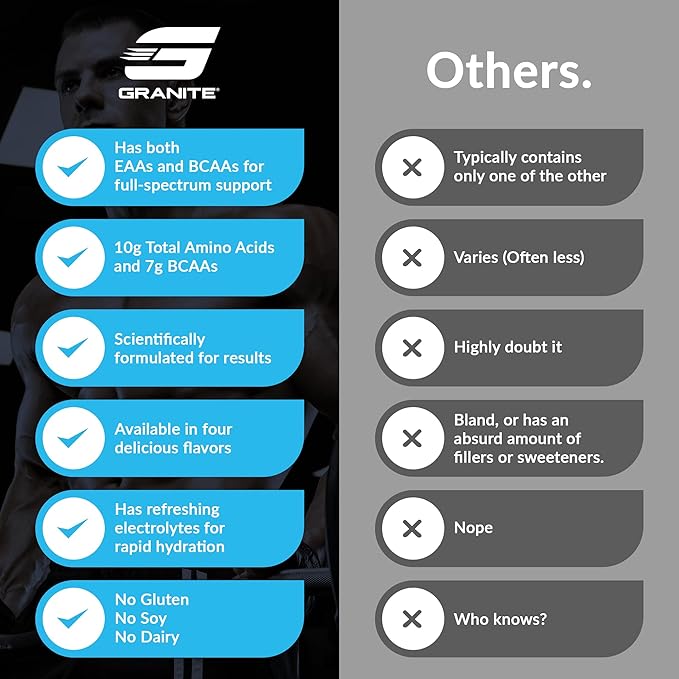 • All-in-One Amino Acids Supplement: Granite EAAs provide 10g of Essential Amino Acids and 7g of BCAAs per serving for growing and rebuilding muscles, and replenishing electrolytes after your toughest workouts.