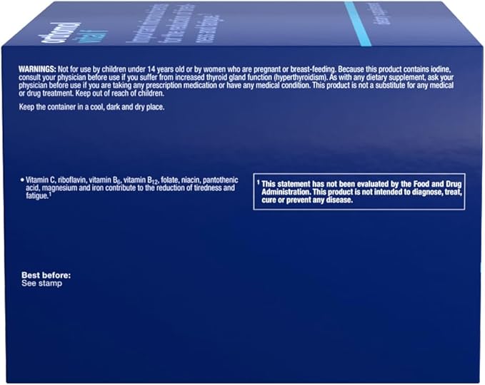 • Contains Vitamin B1 (thiamine), vitamin B2 (riboflavin), vitamin B6, vitamin B12, pantothenic acid, niacin, vitamin C, biotin, magnesium, calcium, iodine, manganese and copper which can contribute to normal energy-yielding metabolism and nervous system*