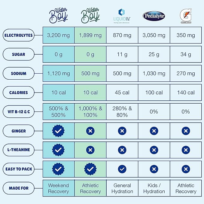 • MADE FOR ADULTS: Most electrolyte mixes and electrolyte drinks on the market are made for kids, general hydration or sports or and are LOADED with sugar. Waterboy weekend recovery is made specifically to help adults. Waterboy includes L-theanine, ginger and vitamins to help you bounce back faster