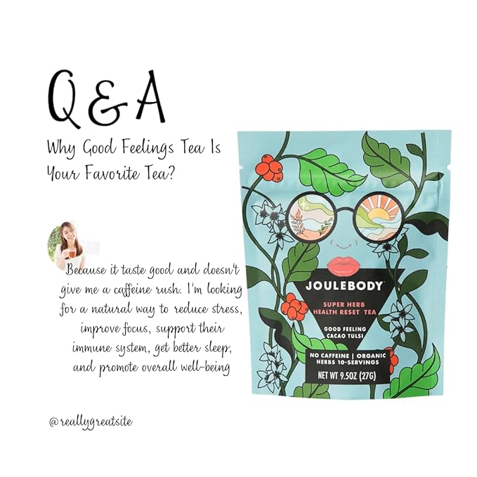 • Organic Tulsi Herbal Tea: JOULEBODY 5 PM Good Feeling Tea combines the power of Holy Basil (Tulsi) with cacao and Ashwagandha for a refreshing, stress-relieving post-workout blend.