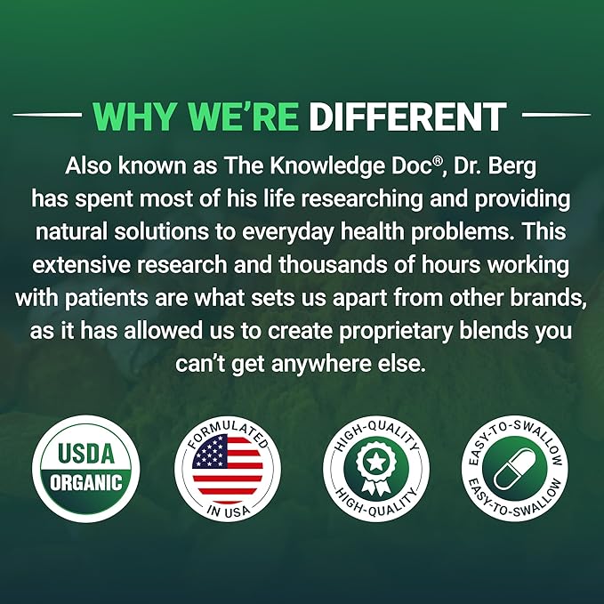 • 𝗪𝗛𝗬 𝗪𝗘’𝗥𝗘 𝗗𝗜𝗙𝗙𝗘𝗥𝗘𝗡𝗧 - Also known as The Knowledge Doc, Dr. Berg has spent most of his life researching and providing natural solutions to everyday health problems. This extensive research and thousands of hours working with patients are what sets us apart from other brands, as it has allowed us to create proprietary blends you can’t get anywhere else.