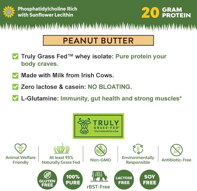 • 100% PURE PREMIUM QUALITY - Your body deserves the highest quality protein so you can feel your best. Our Truly Grass-Fed certified Peanut Butter whey isolate protein powder is made with Organic USA Grown Peanuts and milk from Grass-Fed happy cows. It is also NON-GMO PROJECT VERIFIED, Antibiotic free, rBST-Free, hormone free, gluten free, lactose free and contains no added sugars.