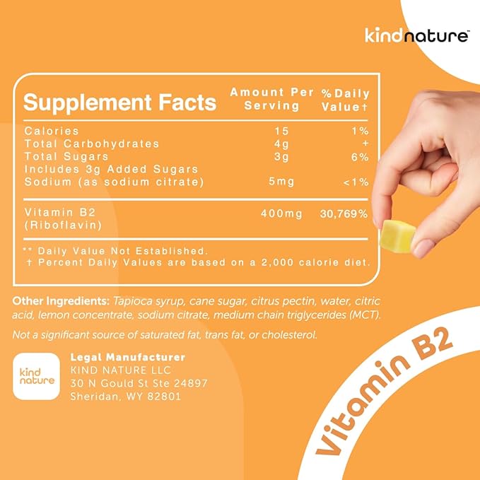 Kind Nature Vitamin B2 Gummies - Riboflavin 400mg Supplement for Kids & Adults - Non-GMO, Soy & Gluten-Free, Vegan Chewable Gummies (30 Day Supply)