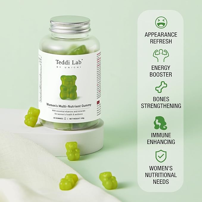 Unichi Women’s Multi-Nutrient Gummy, 18 Essential Vitamins & Minerals Specially Designed for Women, Non-GMO, Lime Flavour, 60 Count