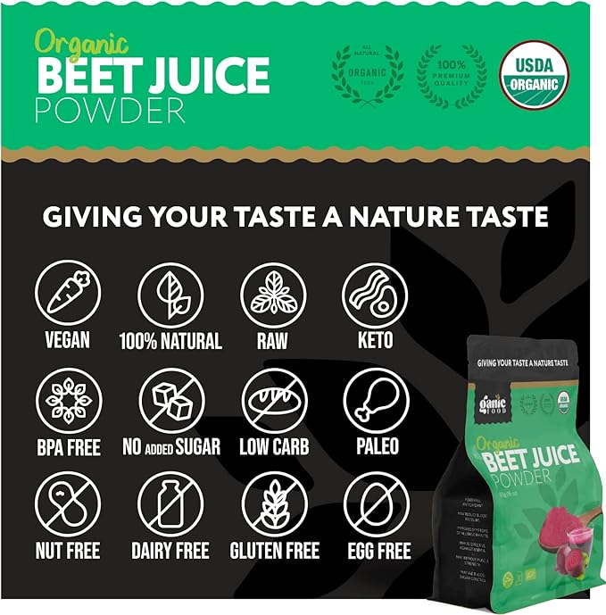 • Our organic powder is rich in natural nitrates acids, our beet juice powder may promote balanced internal circulation health, GMO-free, additive-free, preservative-free, artificial color-free, flavor-free, soy-free, filler-free and gluten-free