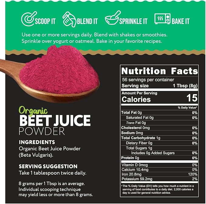 • Our premium beet juice powder is an intense form of pure beet juice powder with a high content of naturally occurring nitric acid for extra energy. This unique formula is crafted with cold-pressed and water-soluble organic beets, giving you an immediate burst of energy to give you the vigor to get through your day.