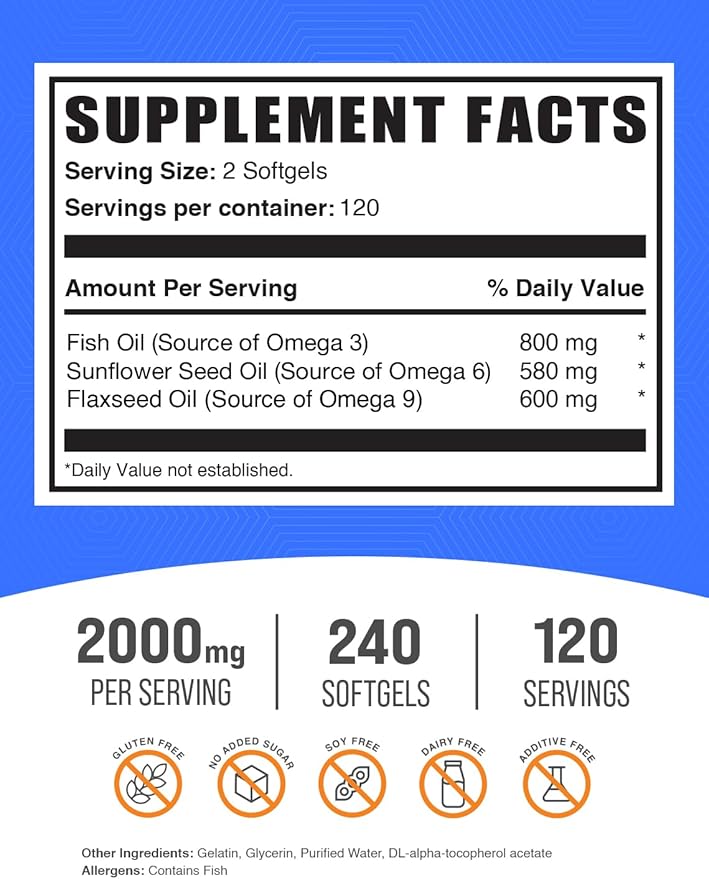BulkSupplements.com Omega 3-6-9 Softgels - Triple Omega Supplement, with Omega 6 & 9, with Fish Oil Omega 3-2 Softgels per Serving, 120-Day Supply, 240 Softgels (Pack of 1)