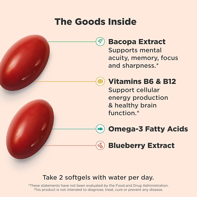 • THE GOODS INSIDE: Expert blend with Bacosides from Bacopa Extract, Blueberry Extract, Omega-3s, and Vitamins B6 and B12.