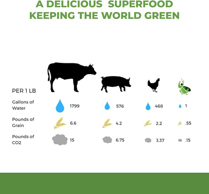 • ➤ THE MOST SUSTAINABLE PROTEIN: Cricket protein requires 2000x less water and emits 100x fewer GHG